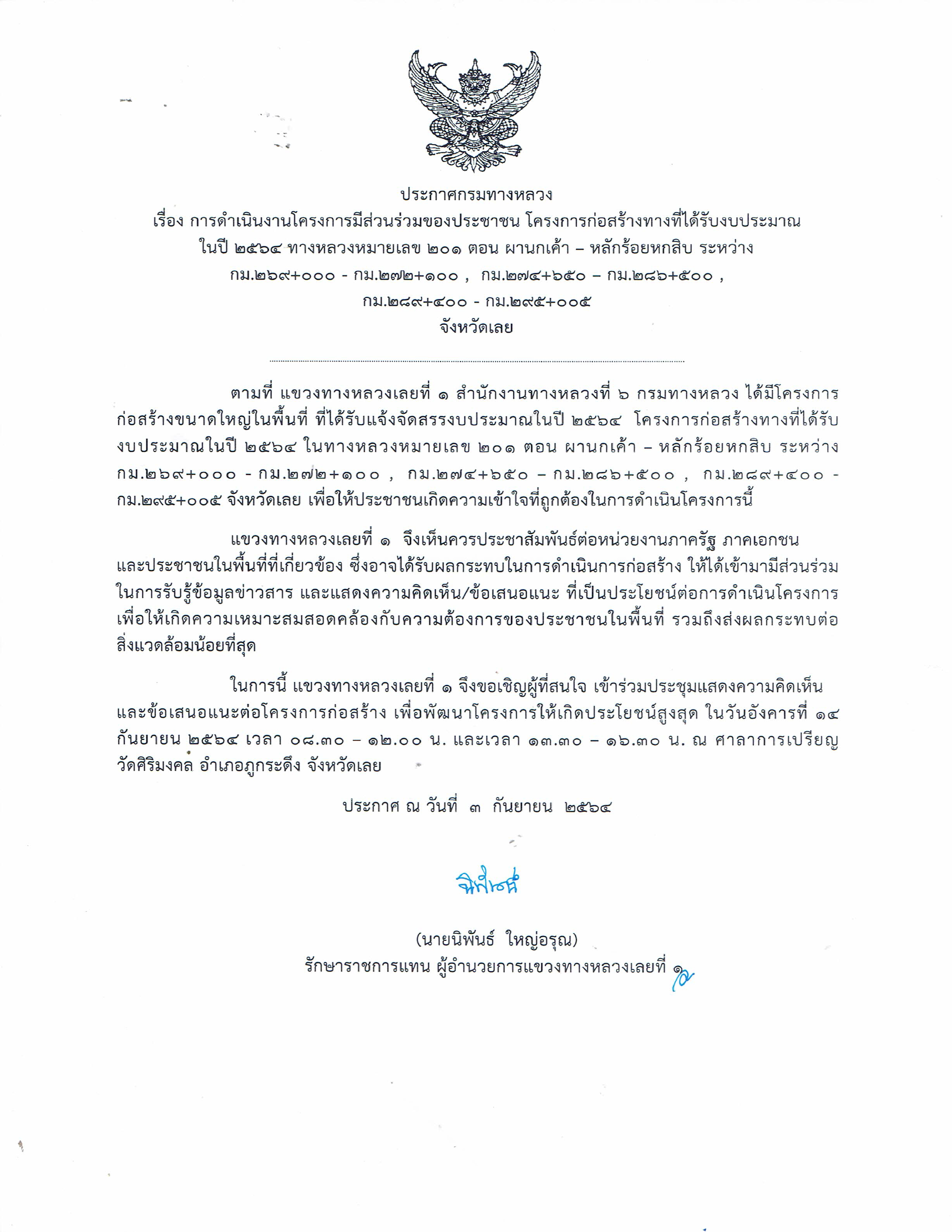 การดำเนินงานโครงการมีส่วนร่วมของประชาชน โครงการก่อสร้างที่ได้รับงบประมาณในปี 2564 ทางหลวง 201