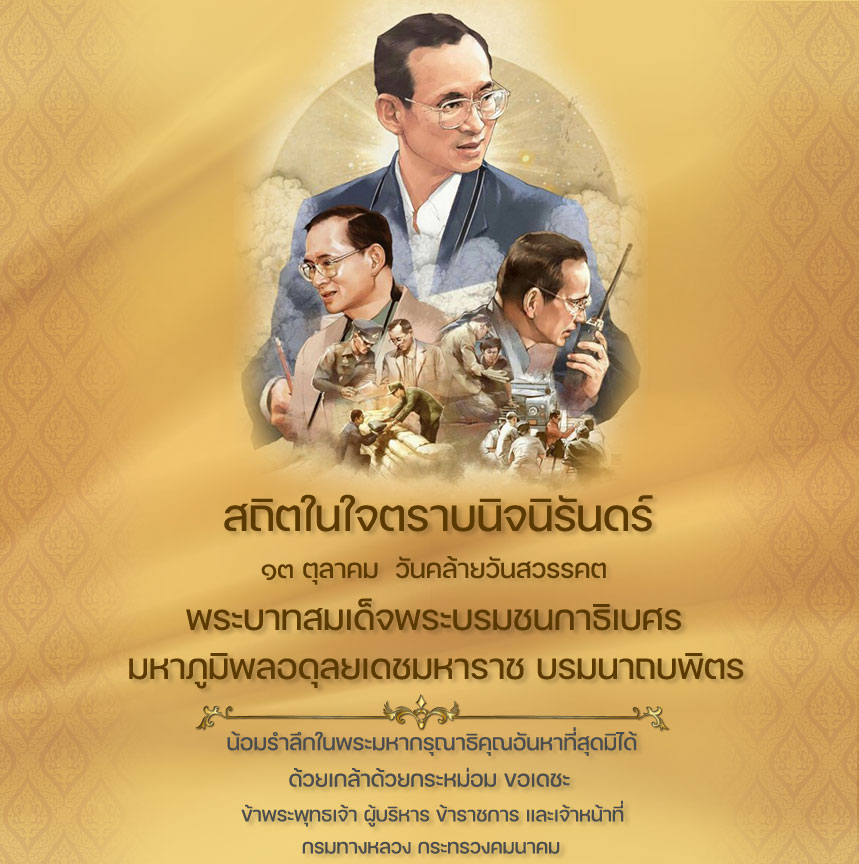 13 ตุลาคม 2565 วันคล้ายวันสวรรคต พระบาทสมเด็จพระบรมชนกาธิเบศร มหาภูมิพลอดุลยเดชมหาราช บรมนาถบพิตร น้อมรำลึกในพระมหากรุณาธิคุณอันหาที่สุดมิได้ ข้าพระพุทธเจ้า ผู้บริหาร ข้าราชการ และเจ้าหน้าที่ กรมทางหลวง กระทรวงคมนาคม