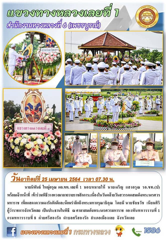 วันอาทิตย์ที่ 25 เมษายน 2564 เวลา 07.30 น. นายนิพันธ์ ใหญ่อรุณ ผอ.ขท.เลยที่ 1 มอบหมายให้ นายเจริญ แสงอรุณ รอ.ขท.(ป) พร้อมเจ้าหน้าที่