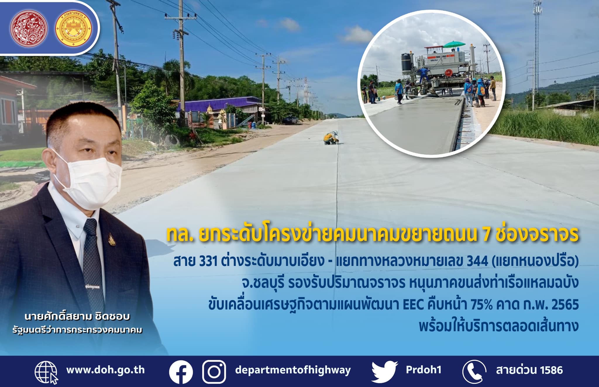 ทล. ยกระดับโครงข่ายคมนาคมขยายถนน 7 ช่องจราจร สาย 331 ต่างระดับมาบเอียง - แยกทางหลวงหมายเลข 344 (แยกหนองปรือ) จ.ชลบุรี รองรับปริมาณจราจร หนุนภาคขนส่งท่าเรือแหลมฉบัง ขับเคลื่อนเศรษฐกิจตามแผนพัฒนา EEC คืบหน้า 75% คาดกุมภาพันธ์ 2565 พร้อมให้บริการตลอดเส้นทาง