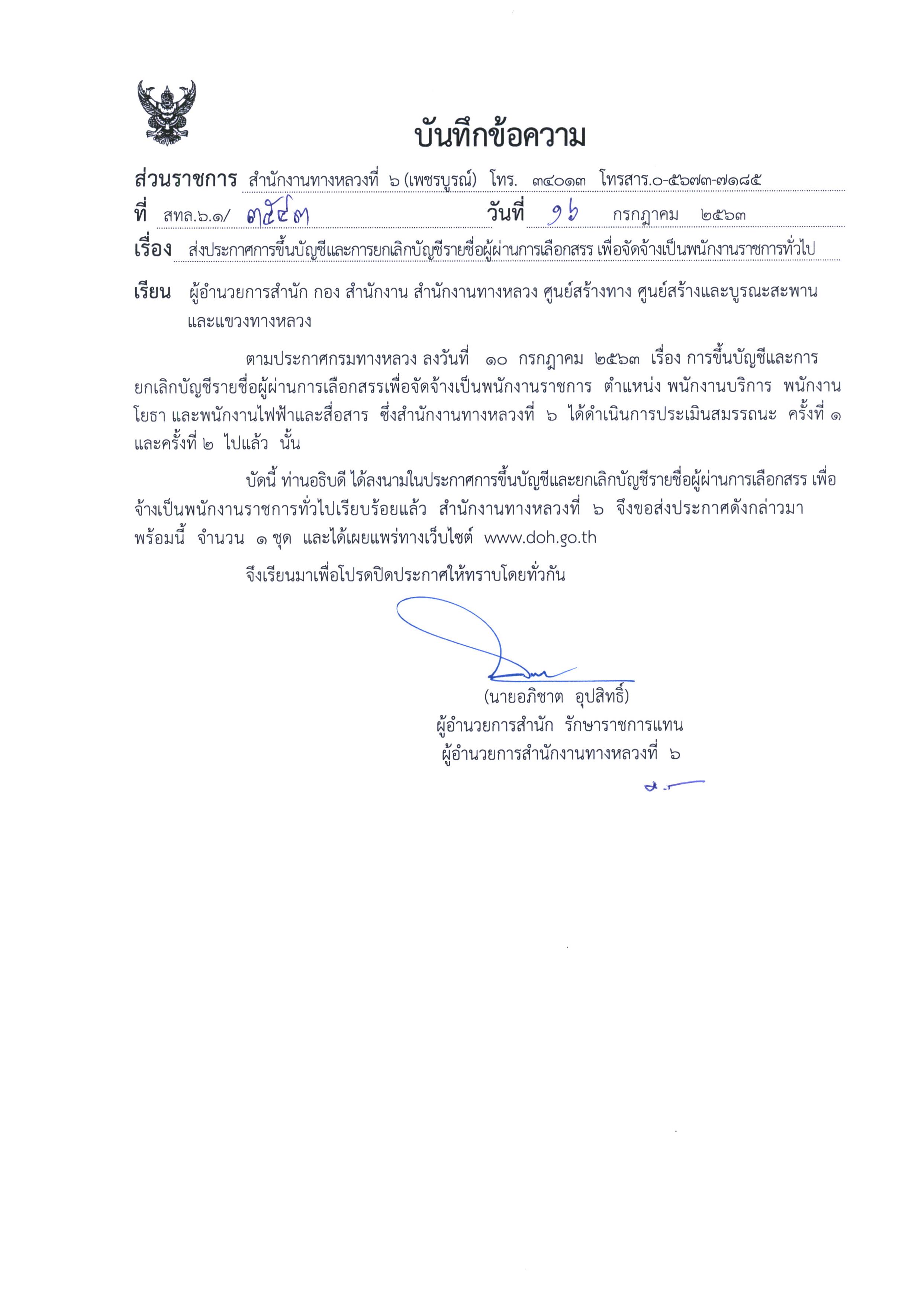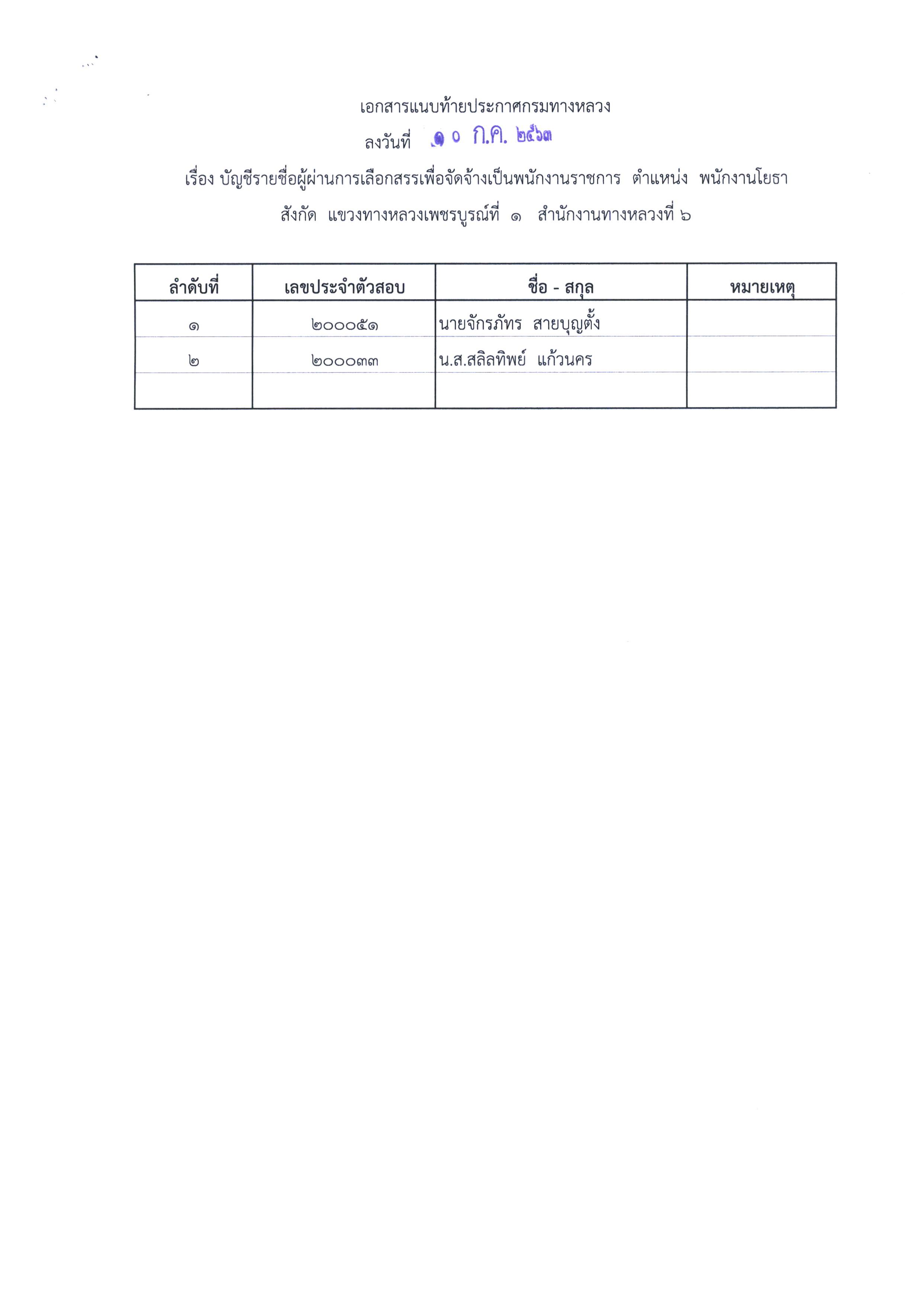 สำนักงานทางหลวงที่ 6 (เพชรบูรณ์) ประกาศผลสอบผู้ผ่านการเลือกสรรเพื่อจัดจ้างเป็นพนักงานราชการทั่วไป ตำแหน่งพนักงานบริการ, ตำแหน่งพนักงานโยธา, ตำแหน่งพนักงานไฟฟ้าและสื่อสาร