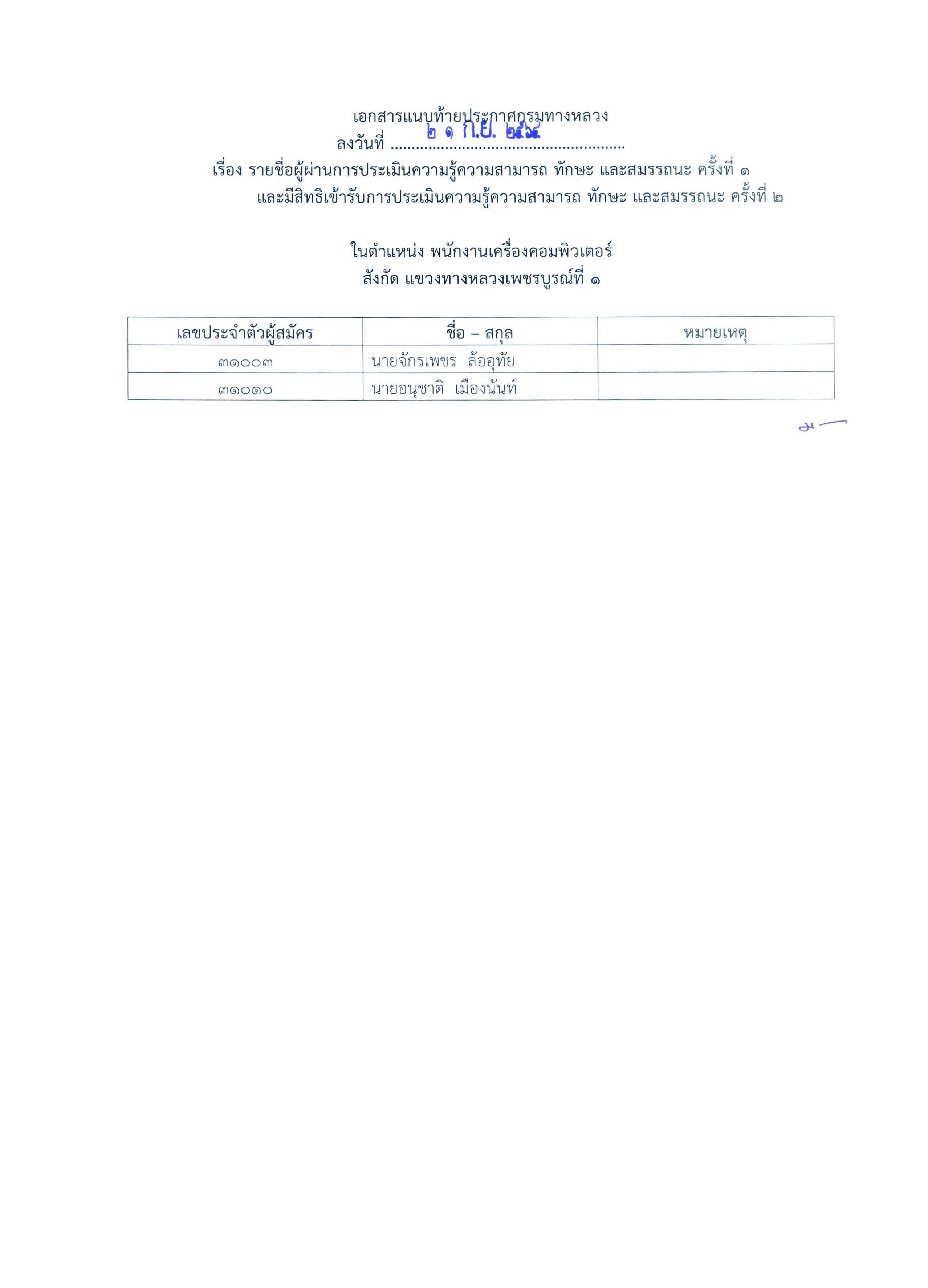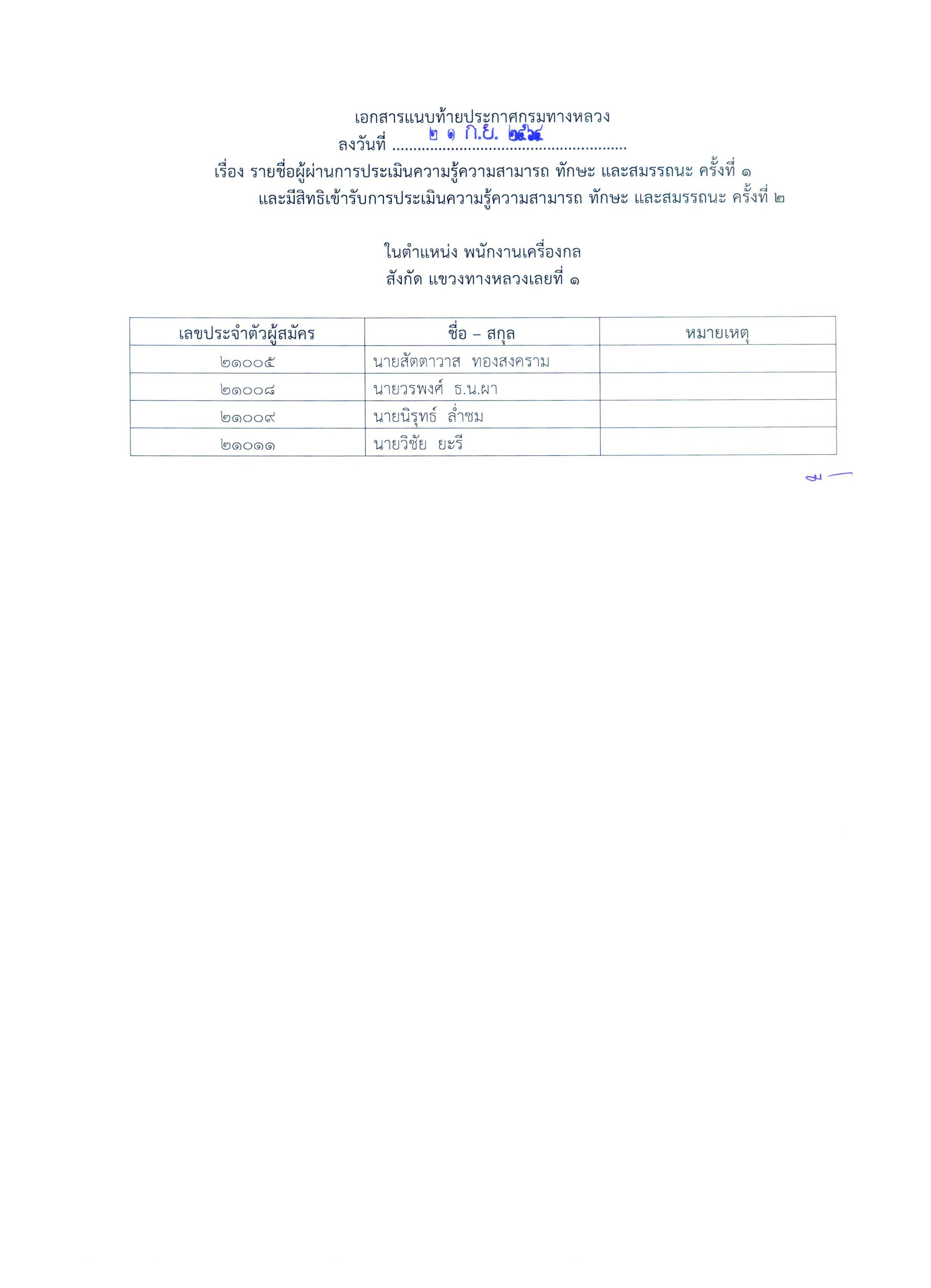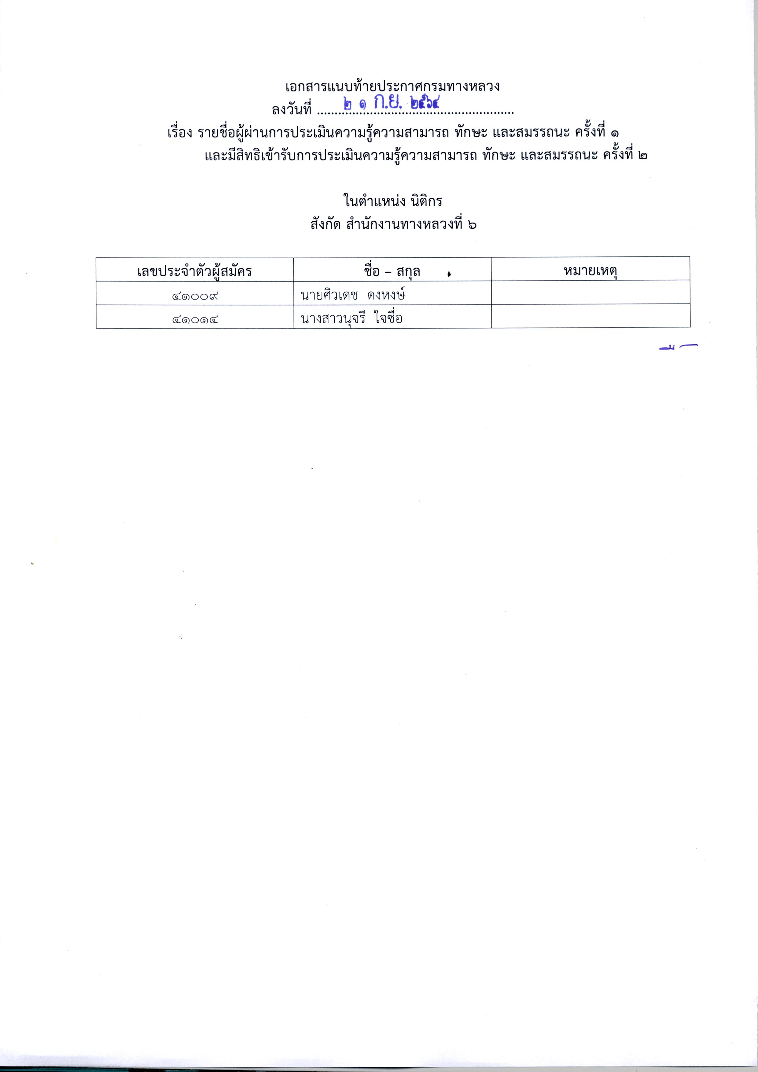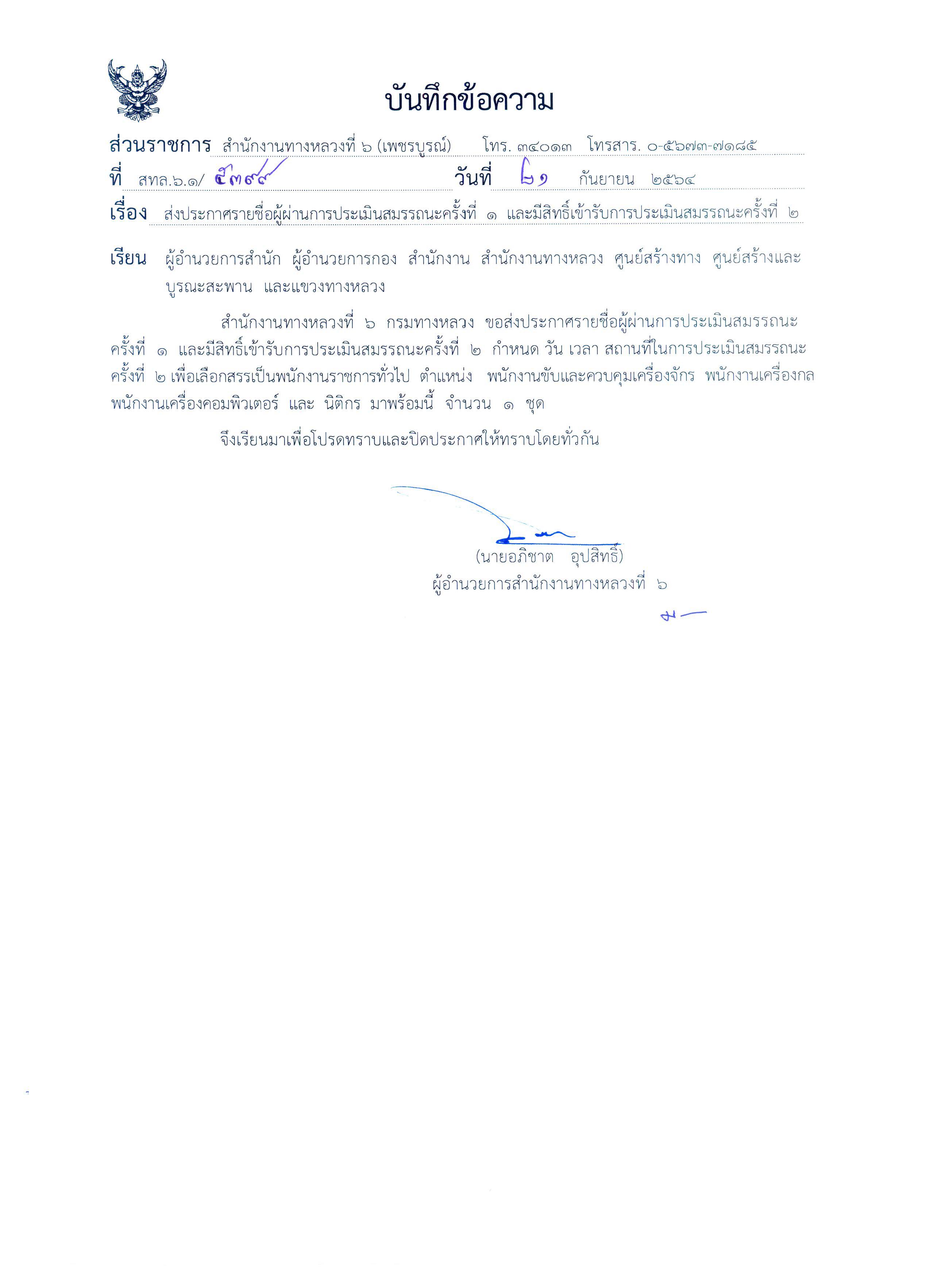 สำนักงานทางหลวงที่ 6 (เพชรบูรณ์) ประกาศผลสอบผู้ผ่านการประเมินสมรรถนะครั้งที่ 1 ตำแหน่งพนักงานขับและควบคุมเครื่องจักร, ตำแหน่งพนักงานเครื่องกล, พนักงานเครื่องคอมพิวเตอร์ และตำแหน่งนิติกร