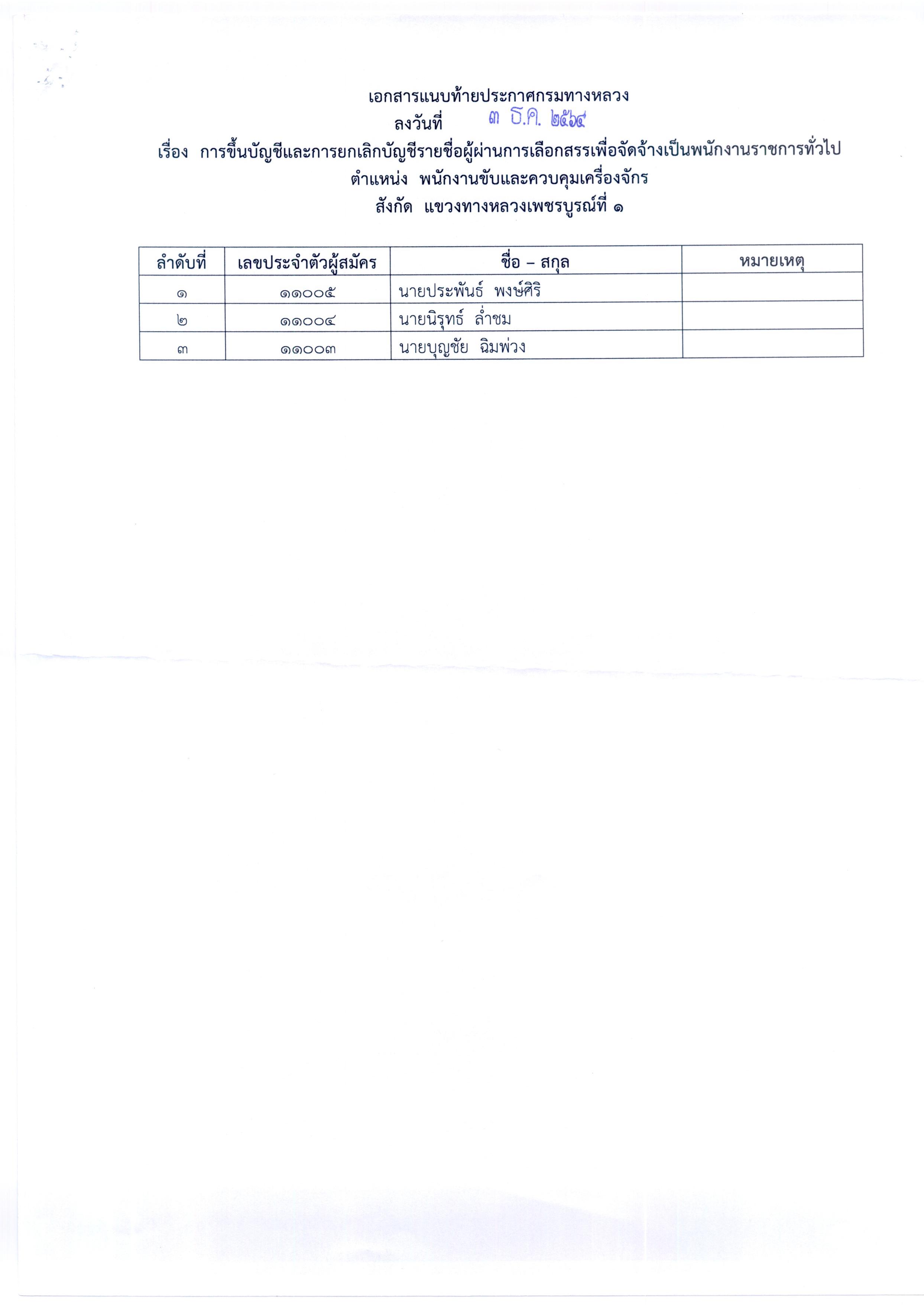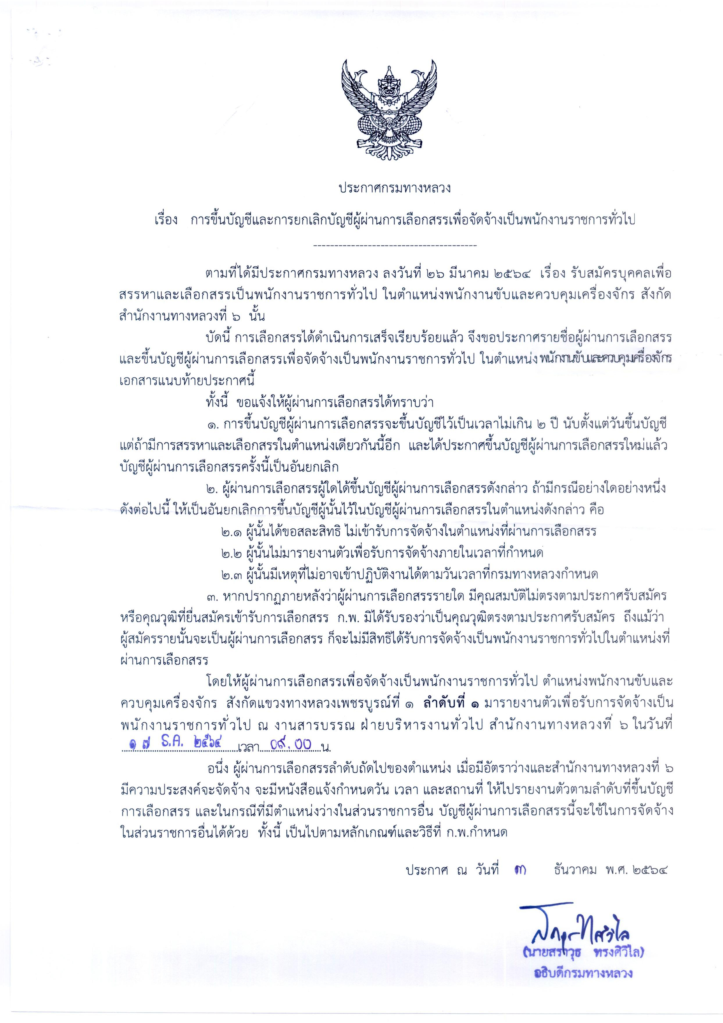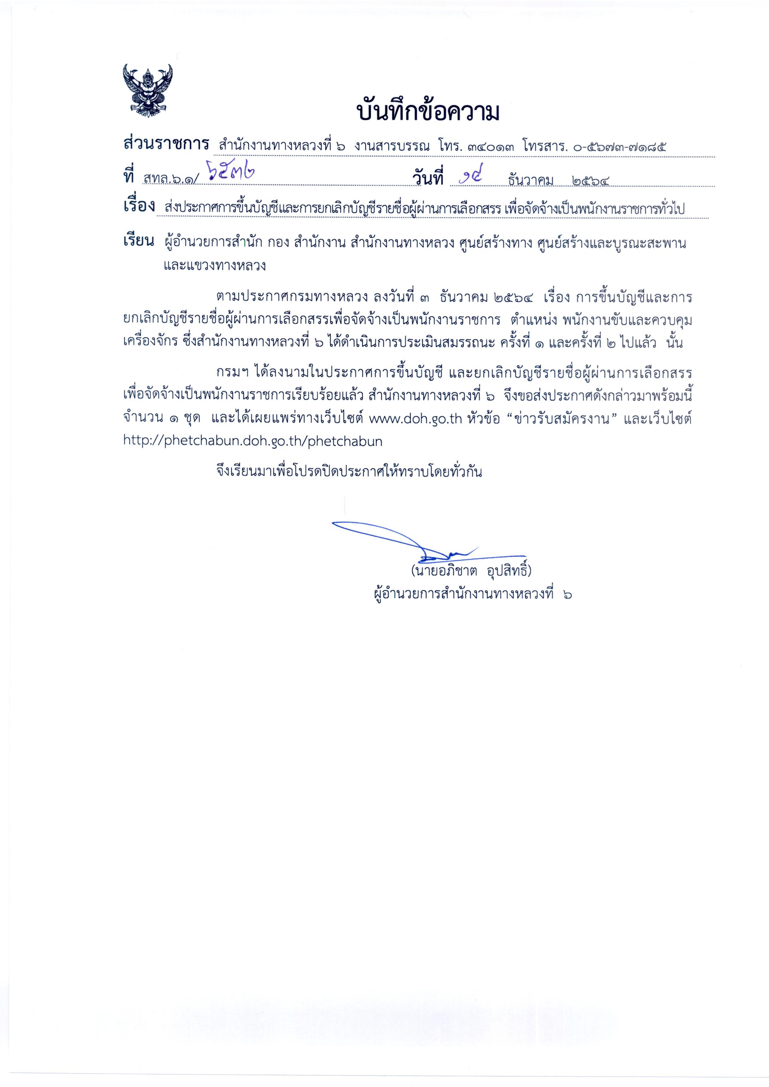 สำนักงานทางหลวงที่ 6 (เพชรบูรณ์) ประกาศผลสอบผู้ผ่านการเลือกสรรเพื่อจัดจ้างเป็นพนักงานราชการทั่วไป ตำแหน่งพนักงานขับและควบคุมเครื่องจักร