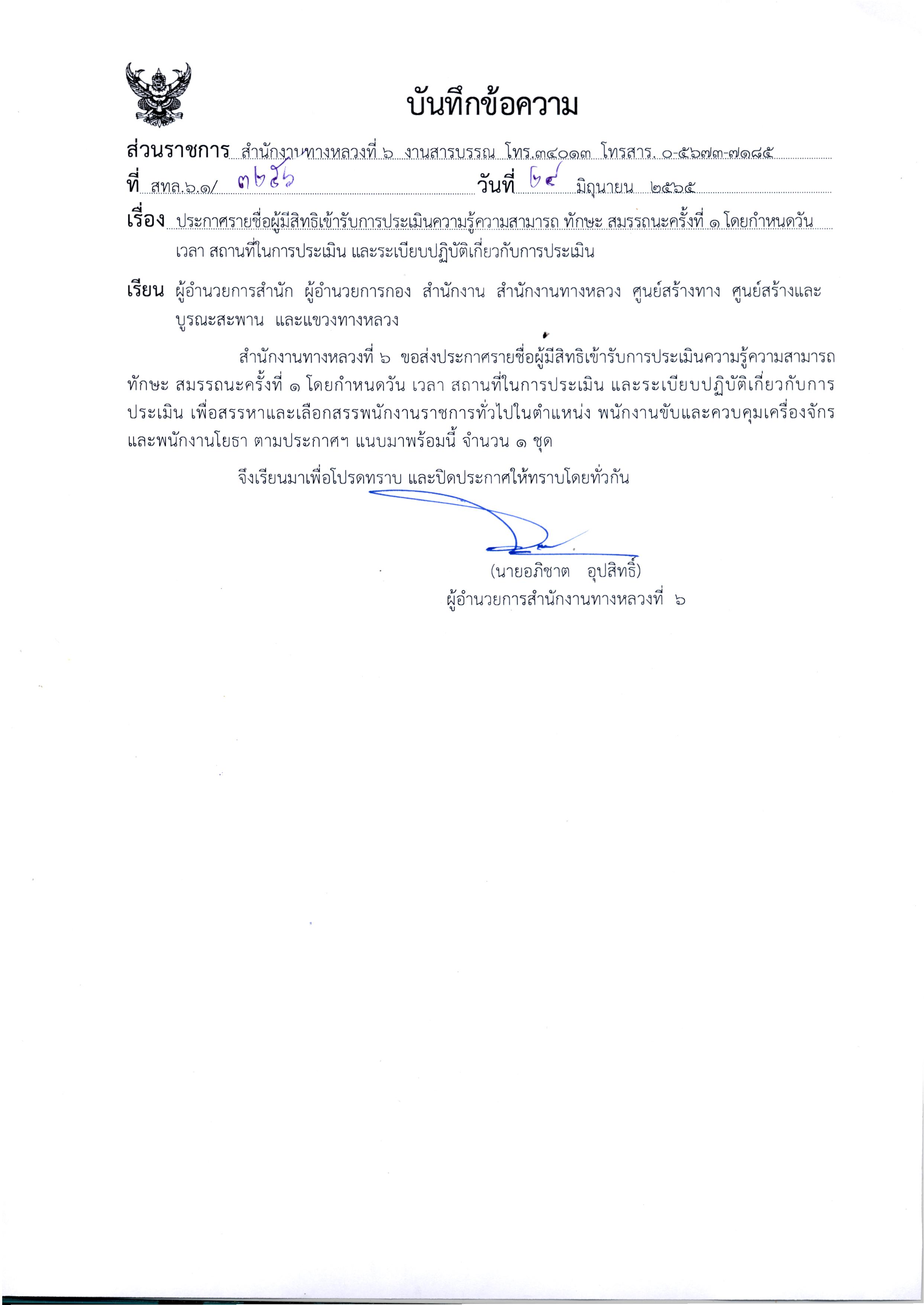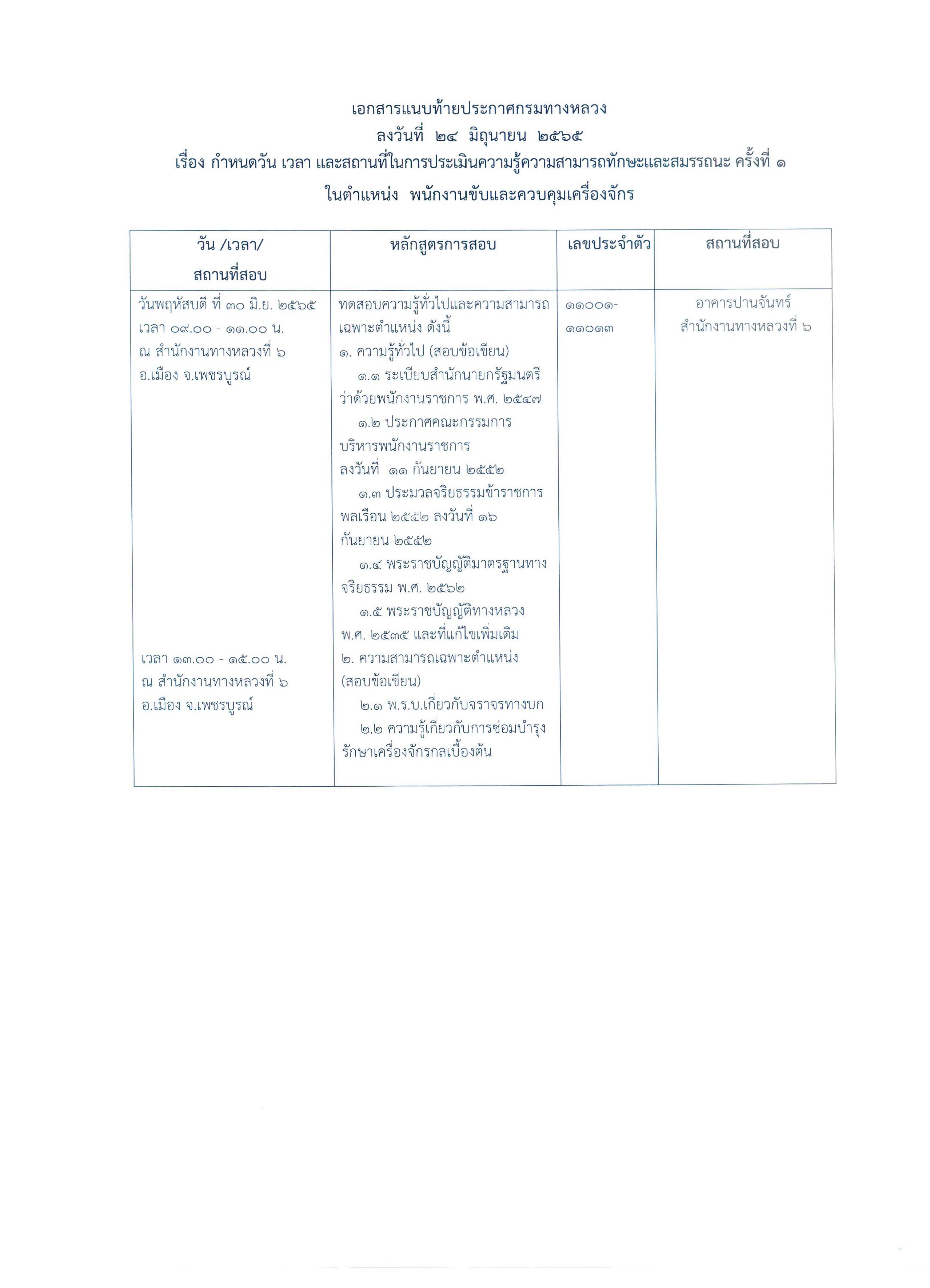 สำนักงานทางหลวงที่ 6 (เพชรบูรณ์) ประกาศรายชื่อผู้มีสิทธิเข้ารับการประเมินสมรรถนะครั้งที่ 1 ตำแหน่งพนักงานขับและควบคุมเครื่องจักร, พนักงานโยธา