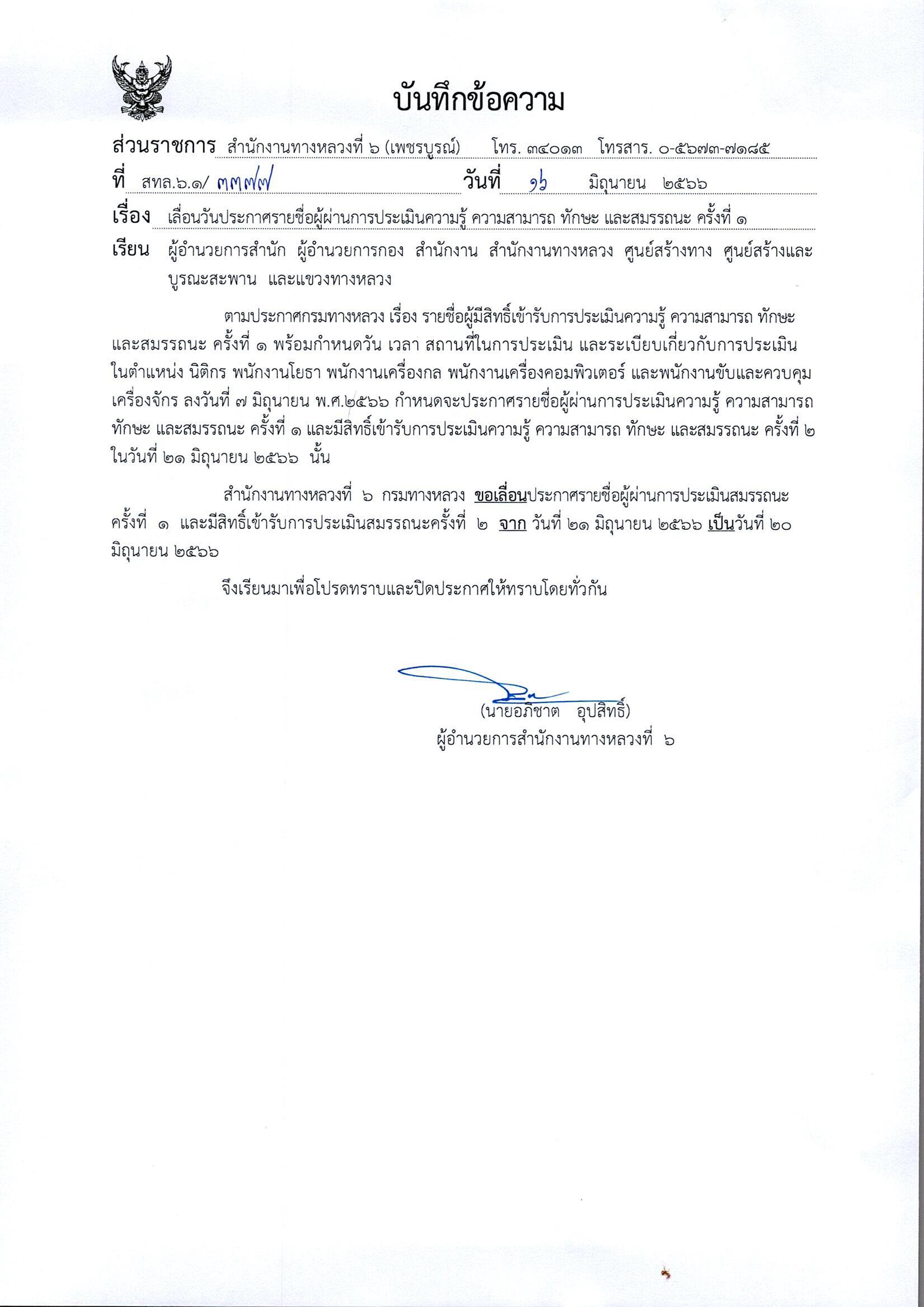สำนักงานทางหลวงที่ 6 (เพชรบูรณ์) ขอเลื่อนวันประกาศผลสอบผู้ผ่านการประเมินสมรรถนะครั้งที่ 1 และกำหนดวัน เวลา สถานที่ในการประเมินสมรรถนะครั้งที่ 2