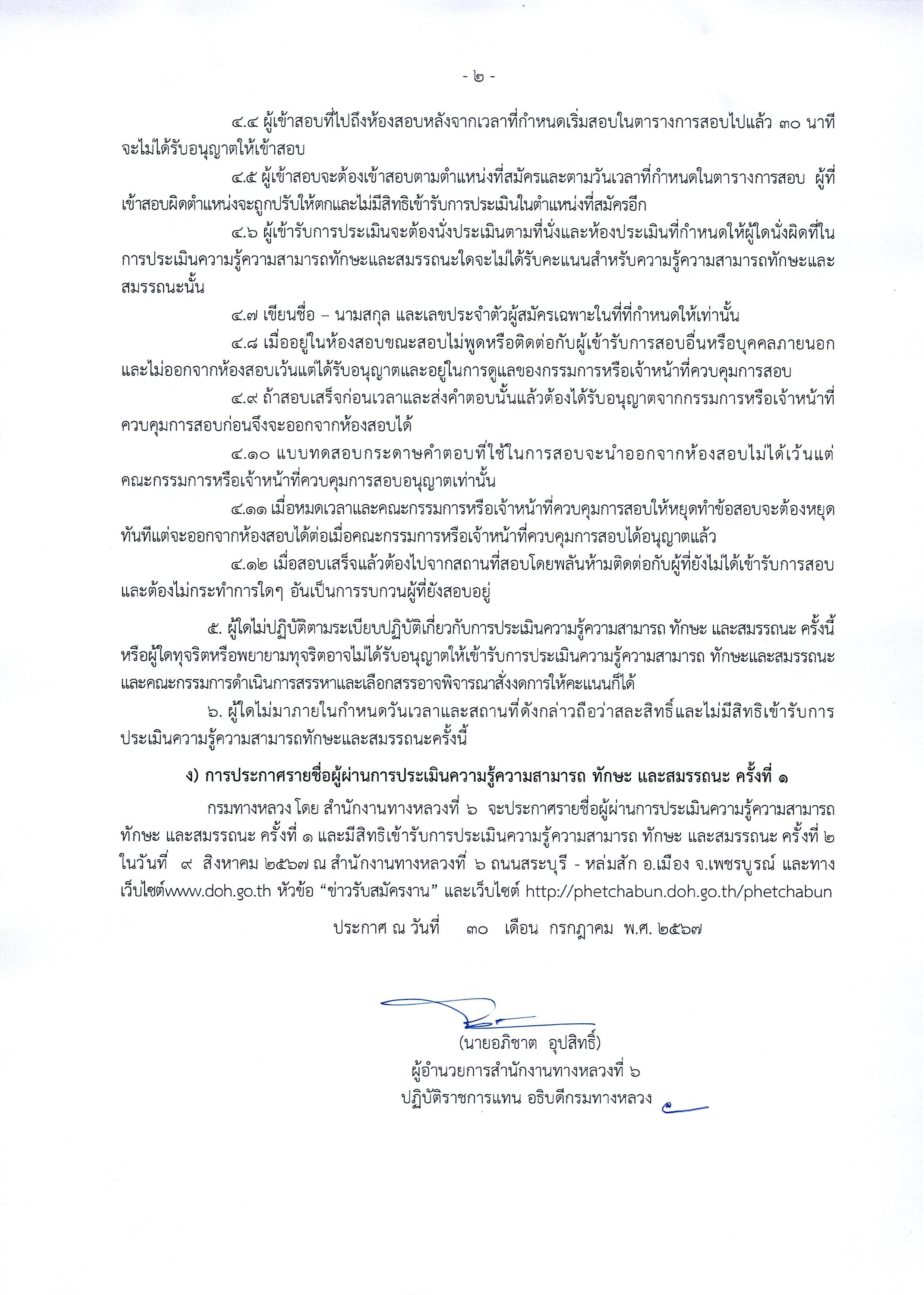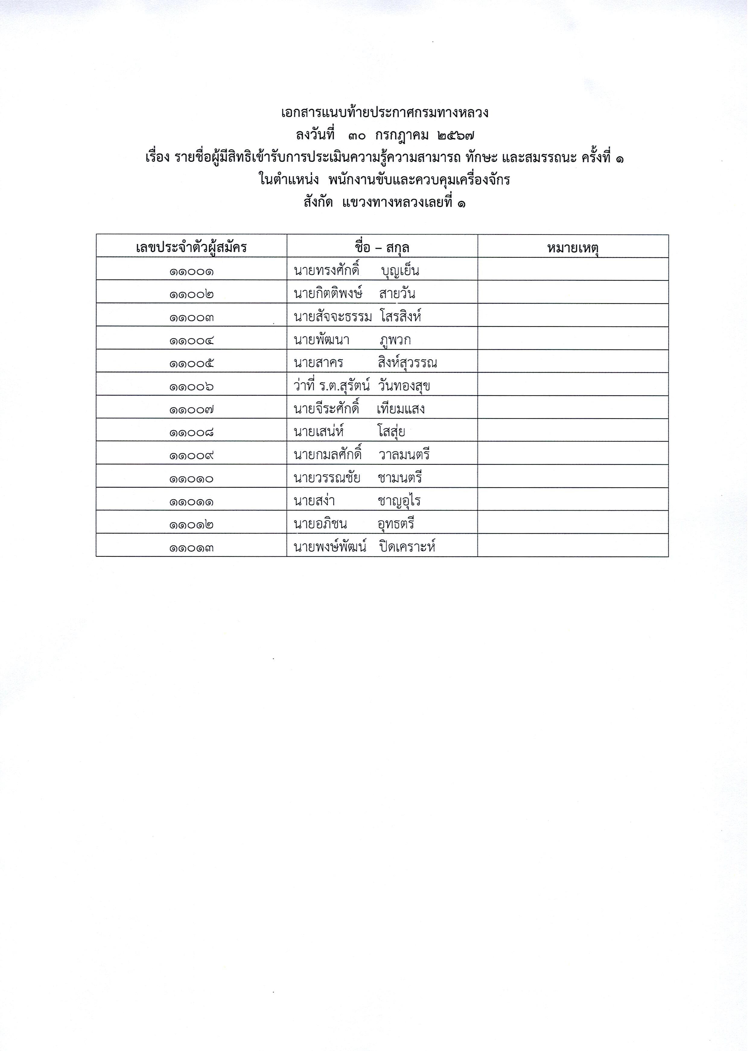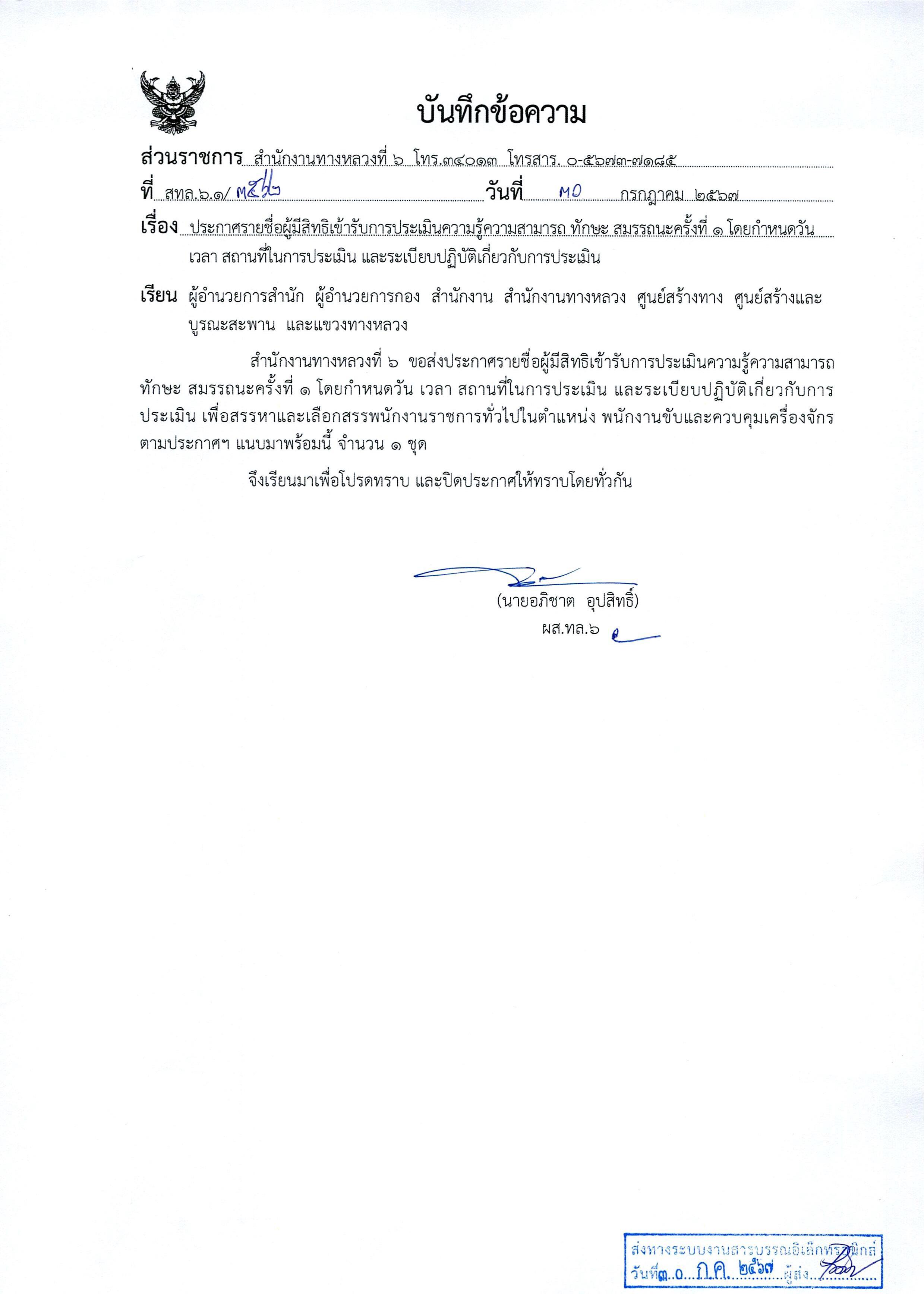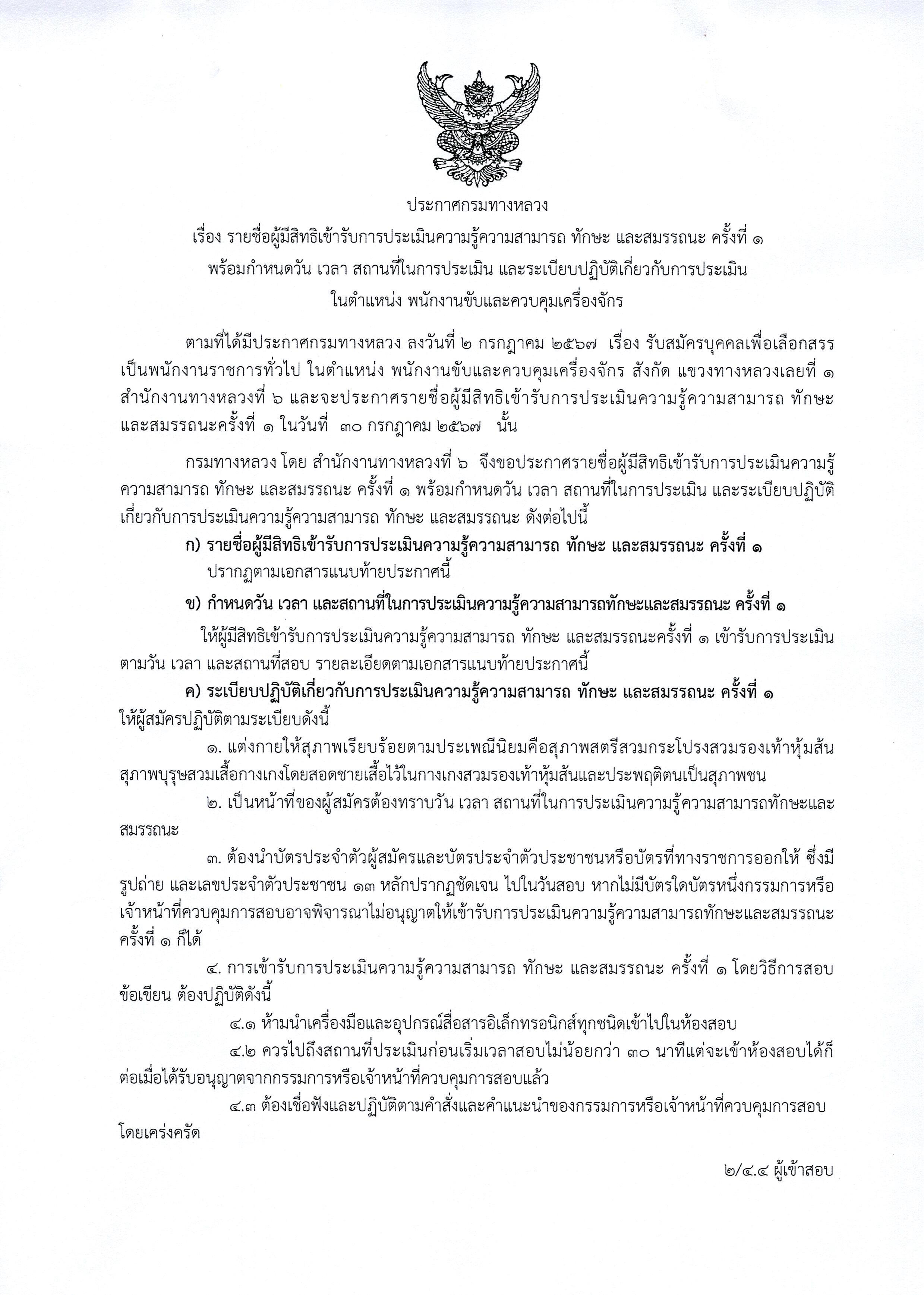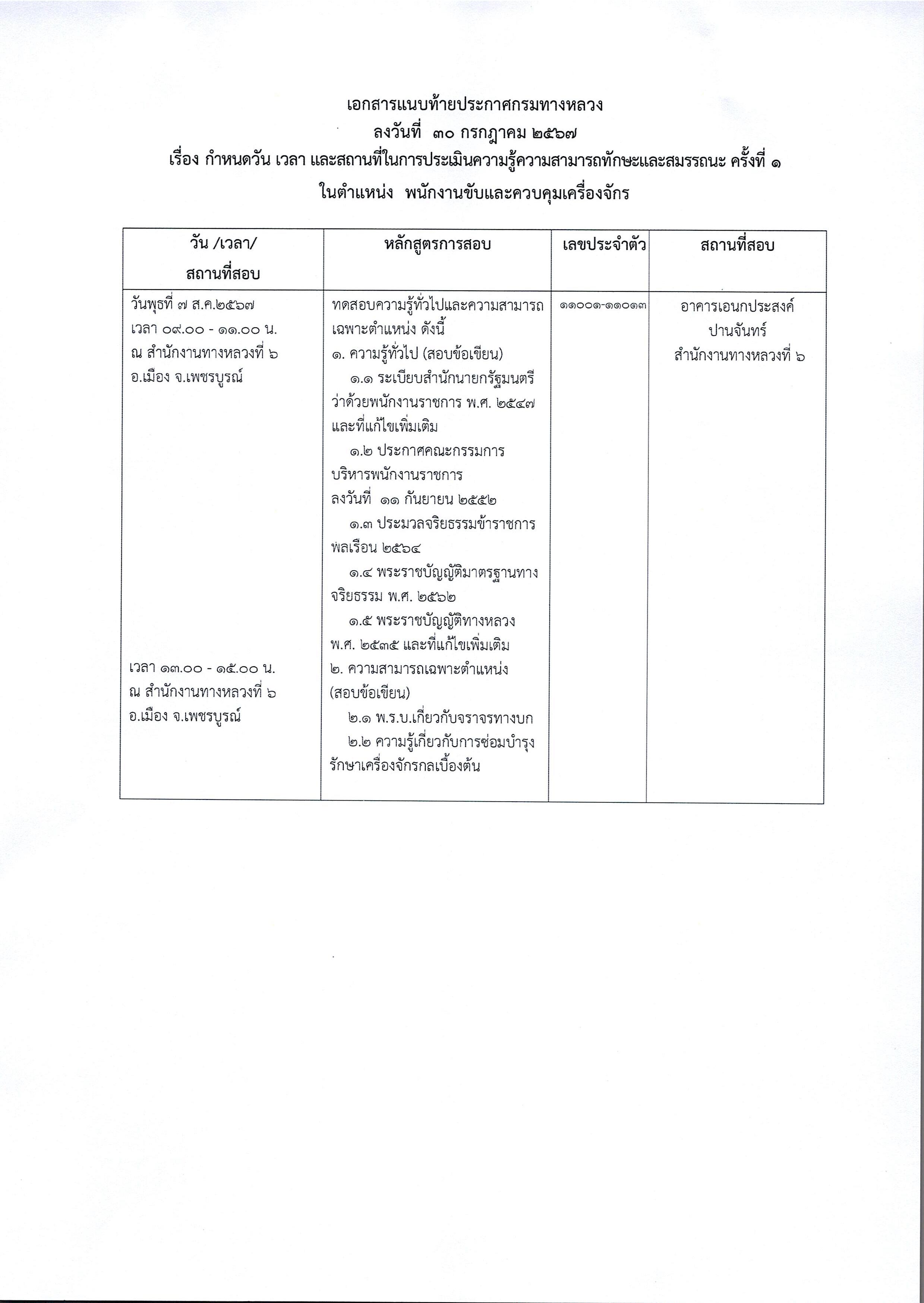 สำนักงานทางหลวงที่ 6 (เพชรบูรณ์) ประกาศรายชื่อผู้มีสิทธิเข้ารับการประเมินสมรรถนะครั้งที่ 1 ตำแหน่งพนักงานขับและควบคุมเครื่องจักร