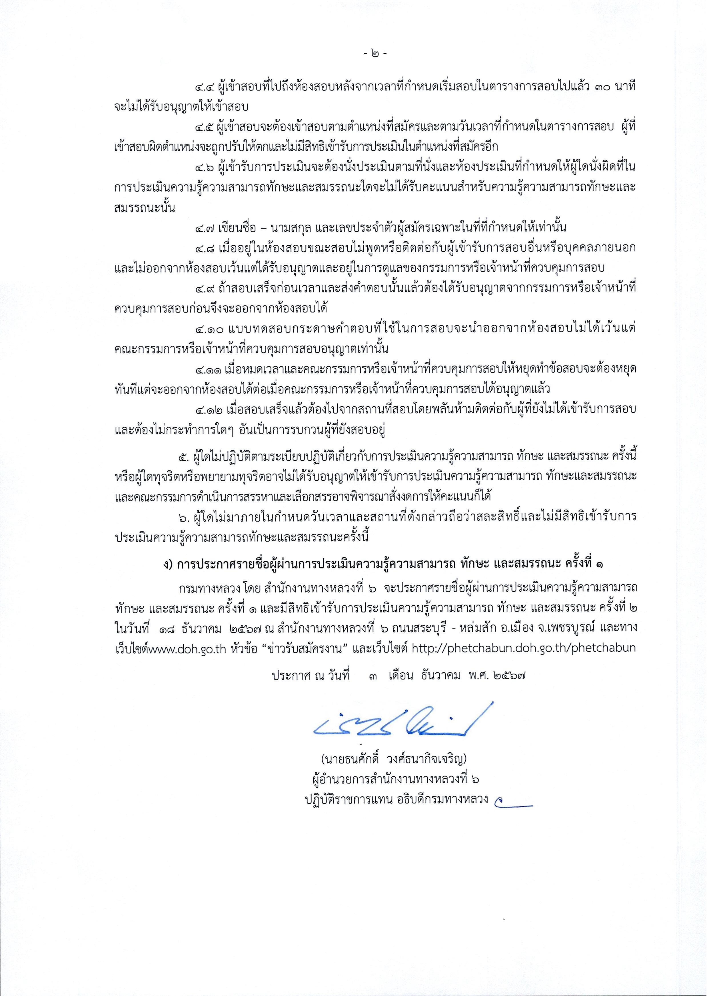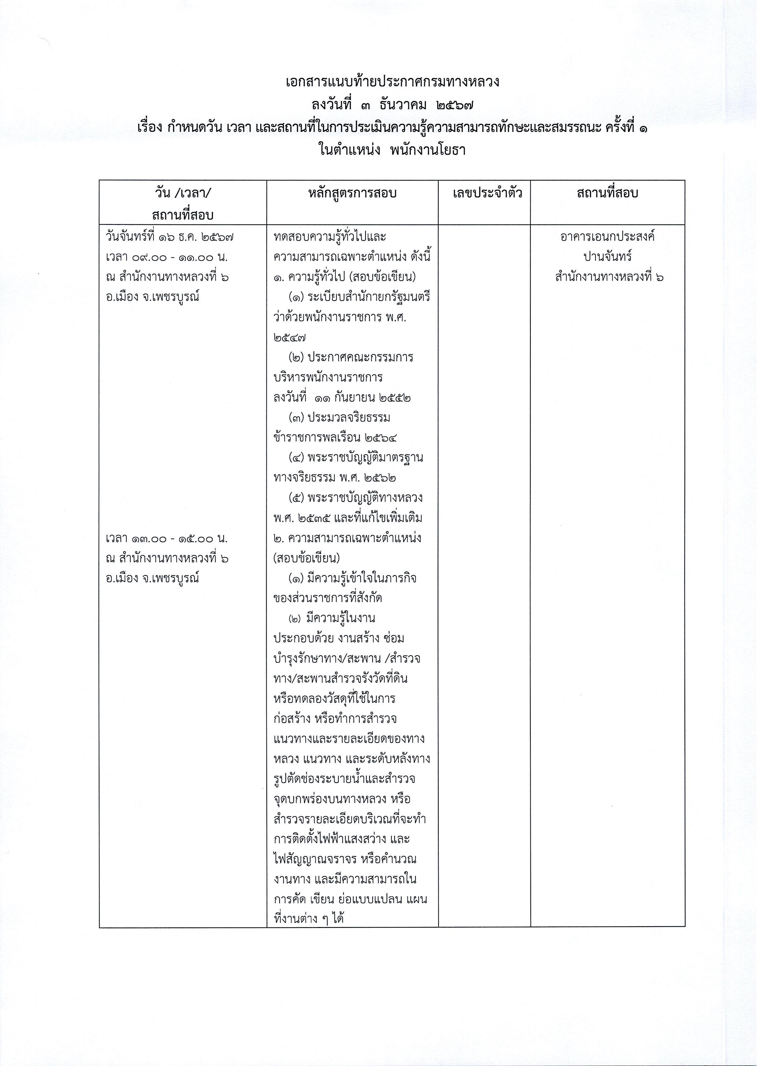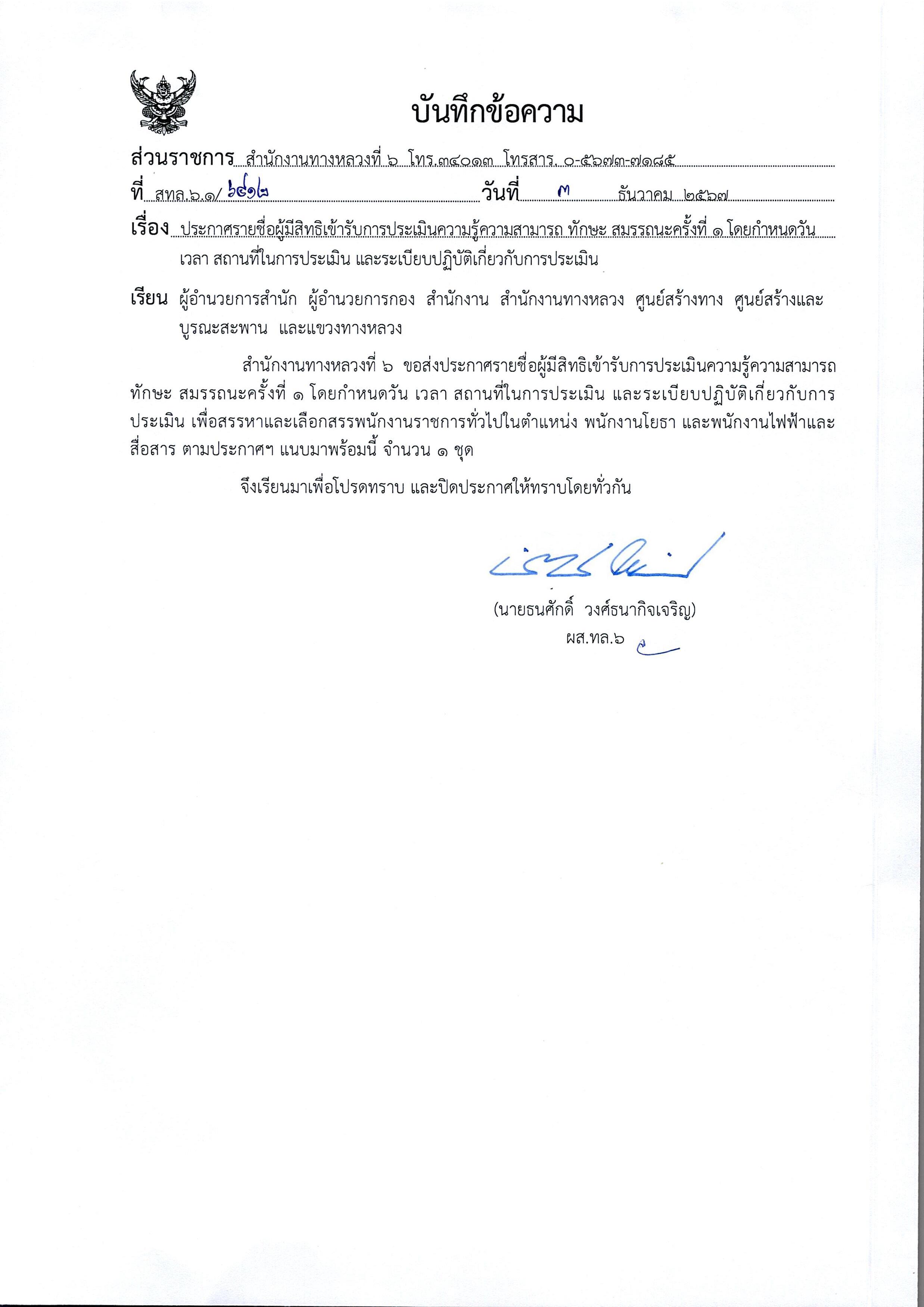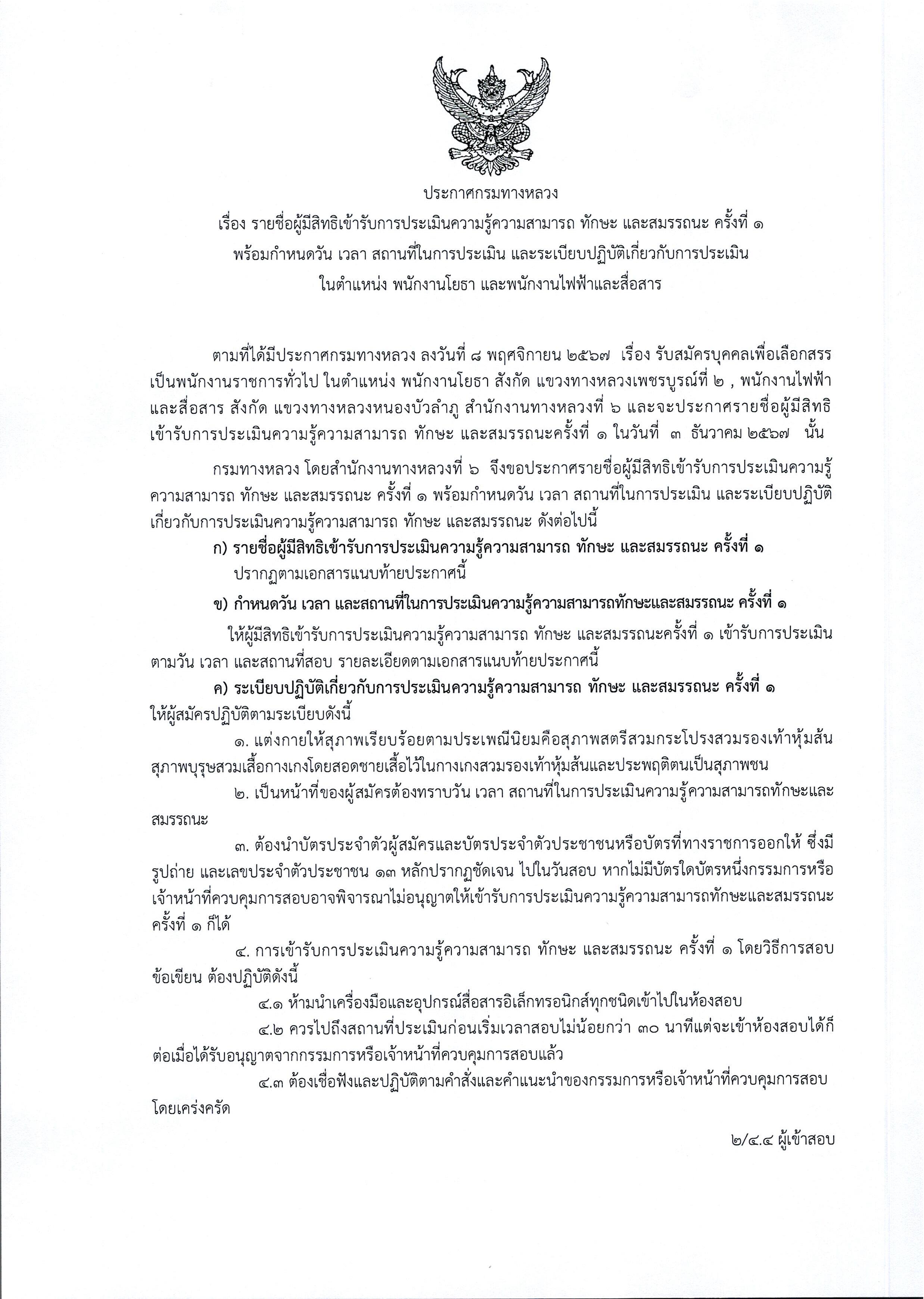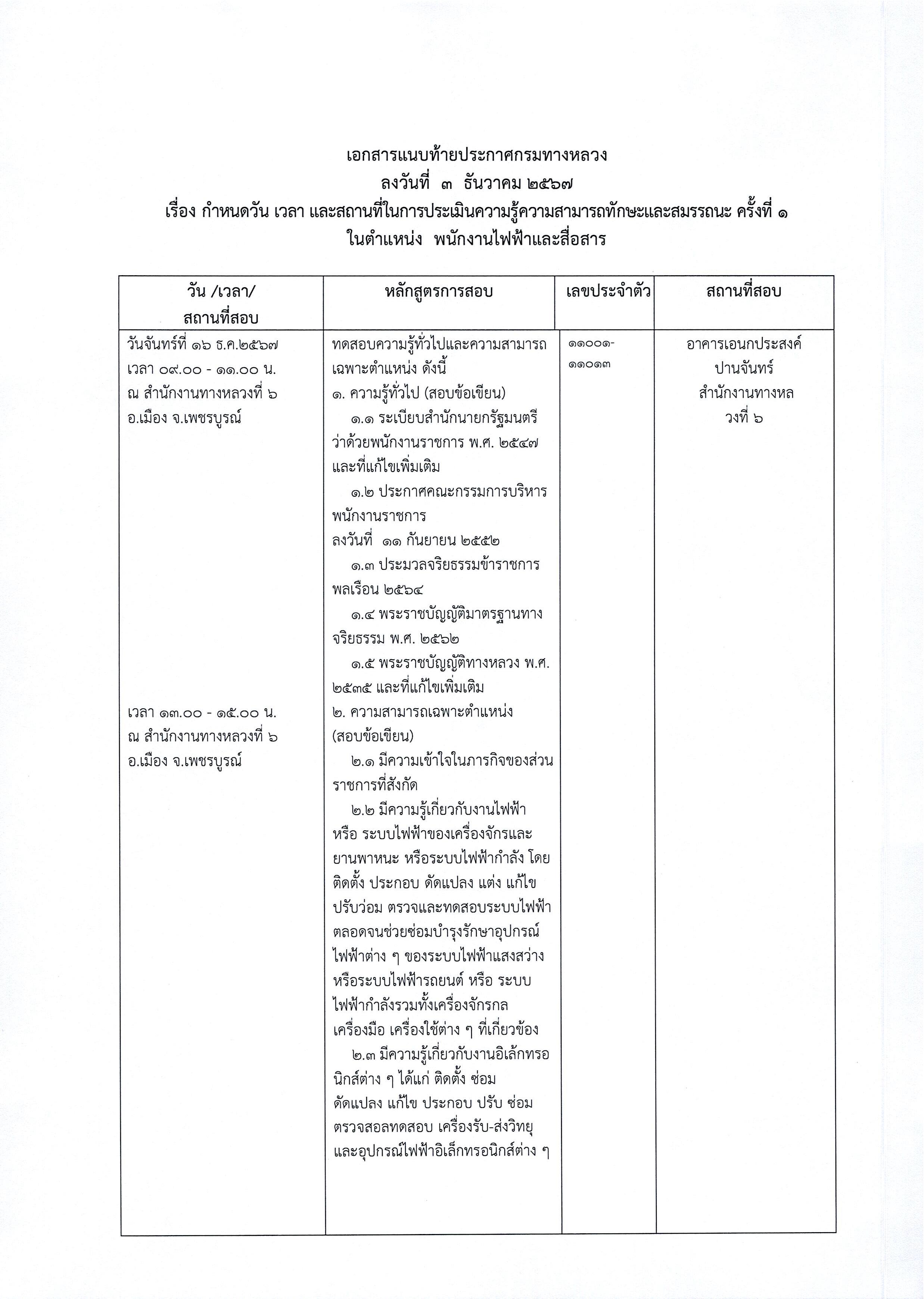 สำนักงานทางหลวงที่ 6 (เพชรบูรณ์) ประกาศรายชื่อผู้มีสิทธิเข้ารับการประเมินสมรรถนะครั้งที่ 1 ตำแหน่งพนักงานโยธา, ตำแหน่งพนักงานไฟฟ้าและสื่อสาร