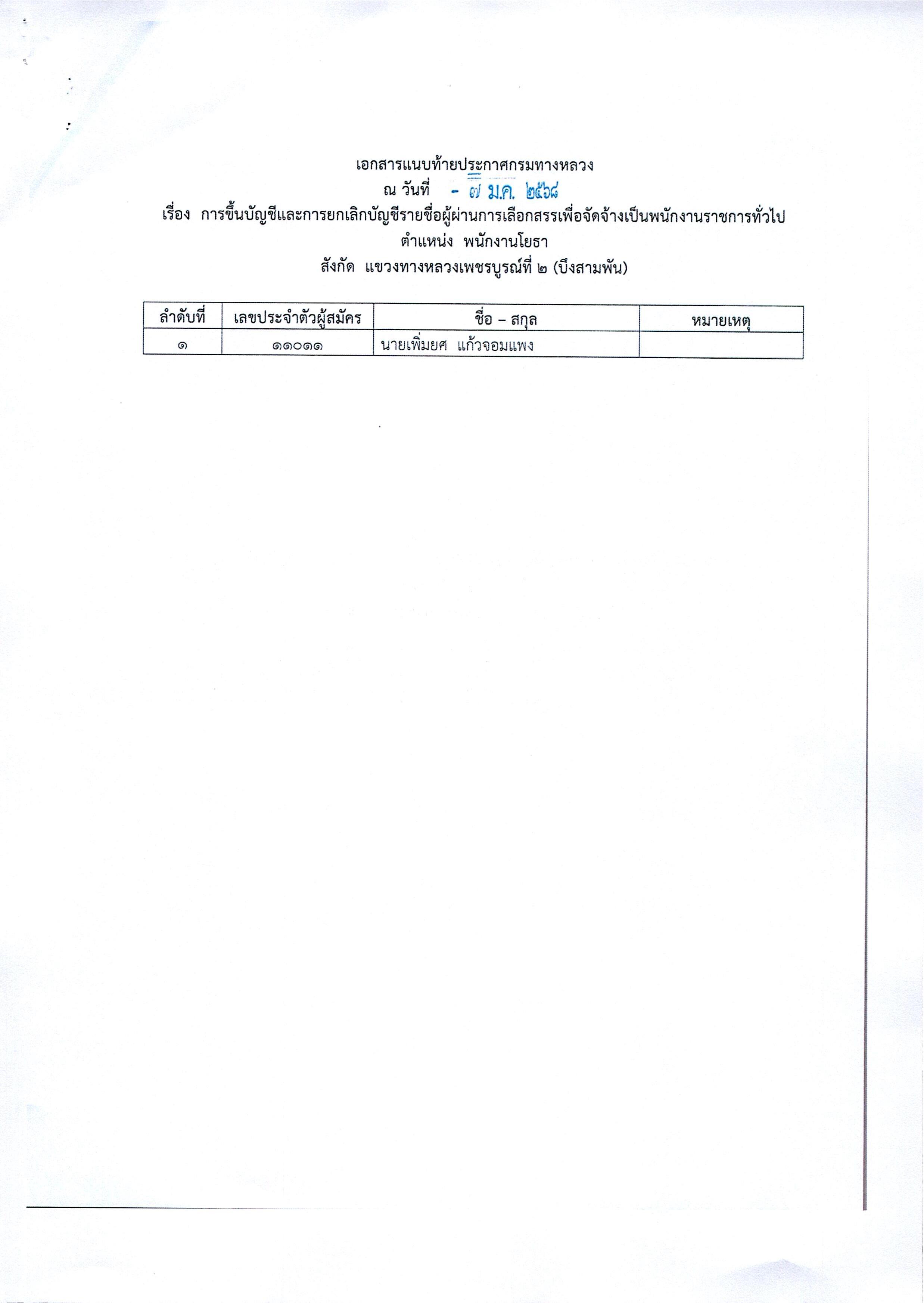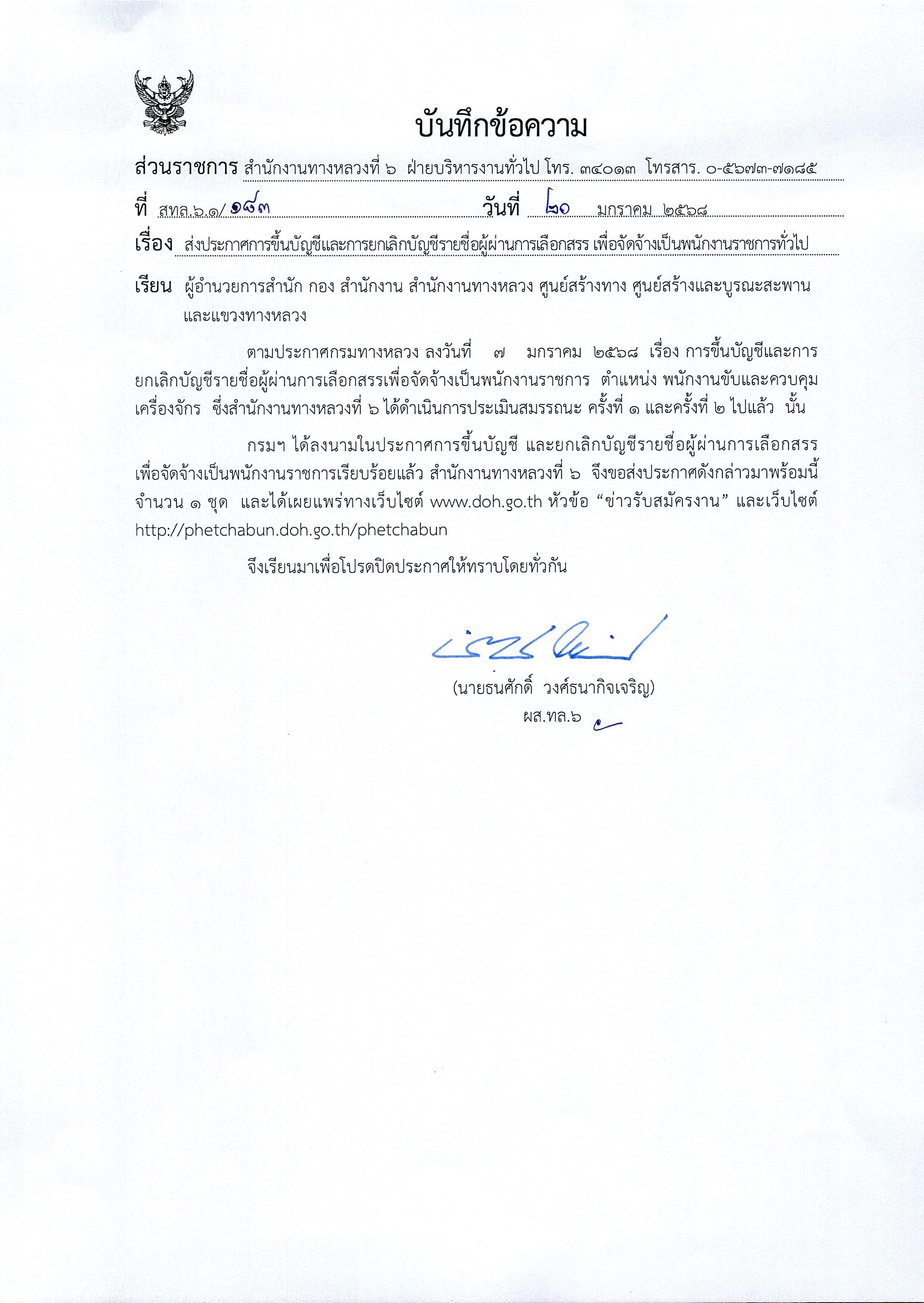 ข้อมูลประกาศรับสมัครพนักงานราชการ : สำนักงานทางหลวงที่ 6 (เพชรบูรณ์) ประกาศผลสอบผู้ผ่านการเลือกสรรเพื่อจัดจ้างเป็นพนักงานราชการทั่วไป ตำแหน่งพนักงานโยธา และตำแหน่งพนักงานไฟฟ้าและสื่อสาร
