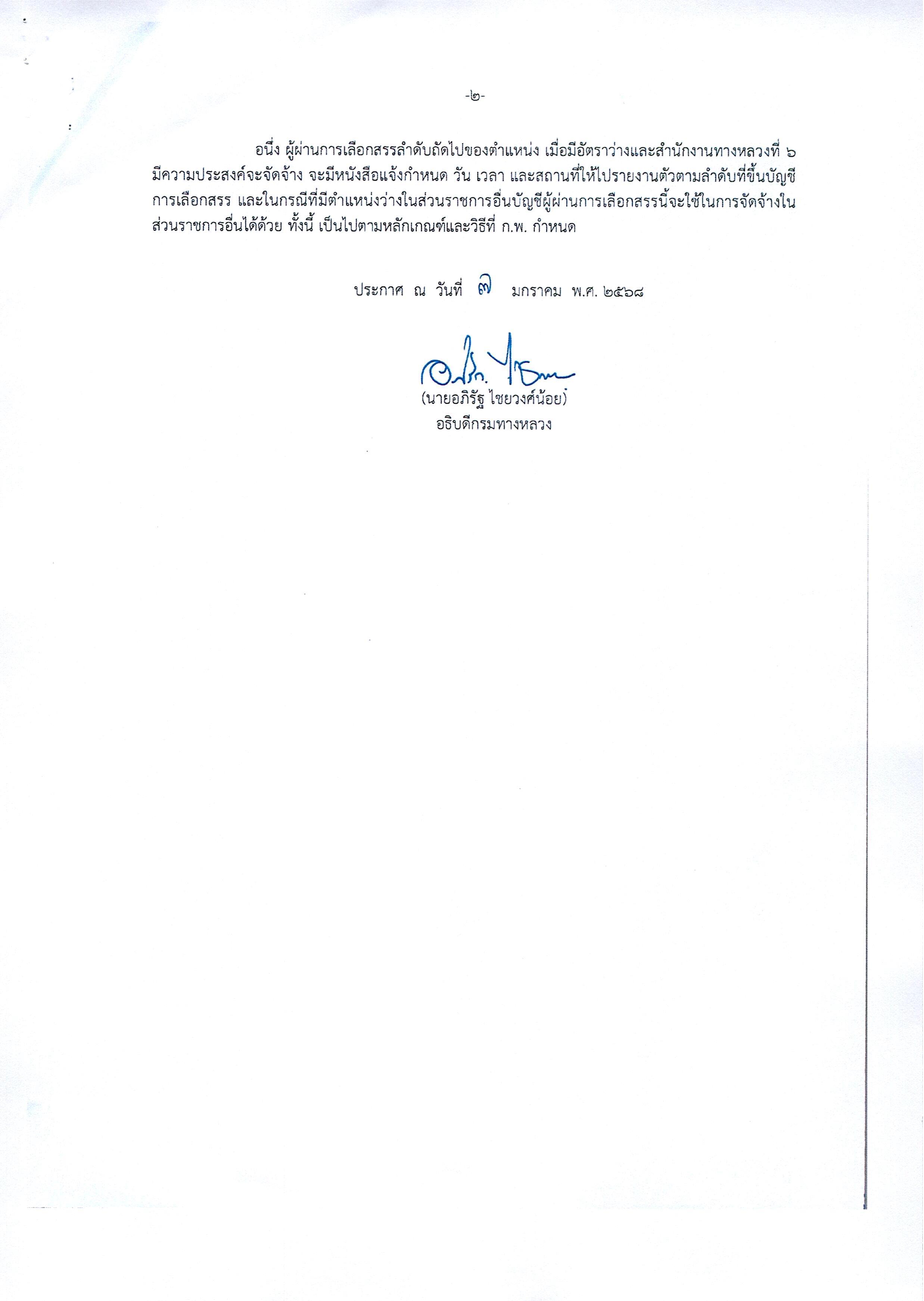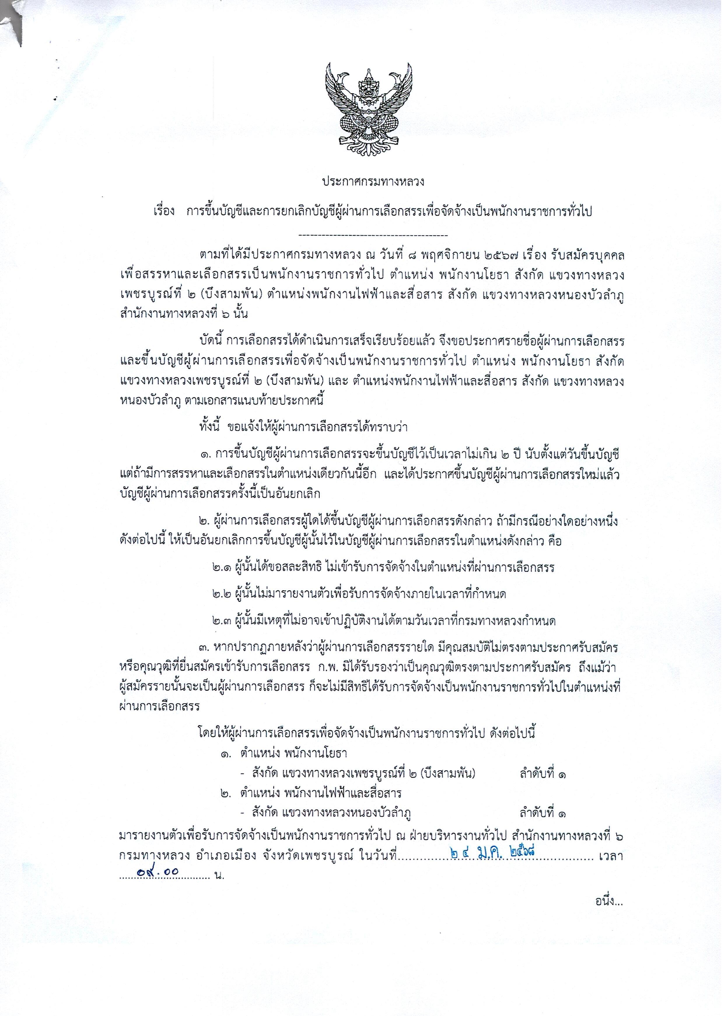 สำนักงานทางหลวงที่ 6 (เพชรบูรณ์) ประกาศผลสอบผู้ผ่านการเลือกสรรเพื่อจัดจ้างเป็นพนักงานราชการทั่วไป ตำแหน่งพนักงานโยธา และตำแหน่งพนักงานไฟฟ้าและสื่อสาร