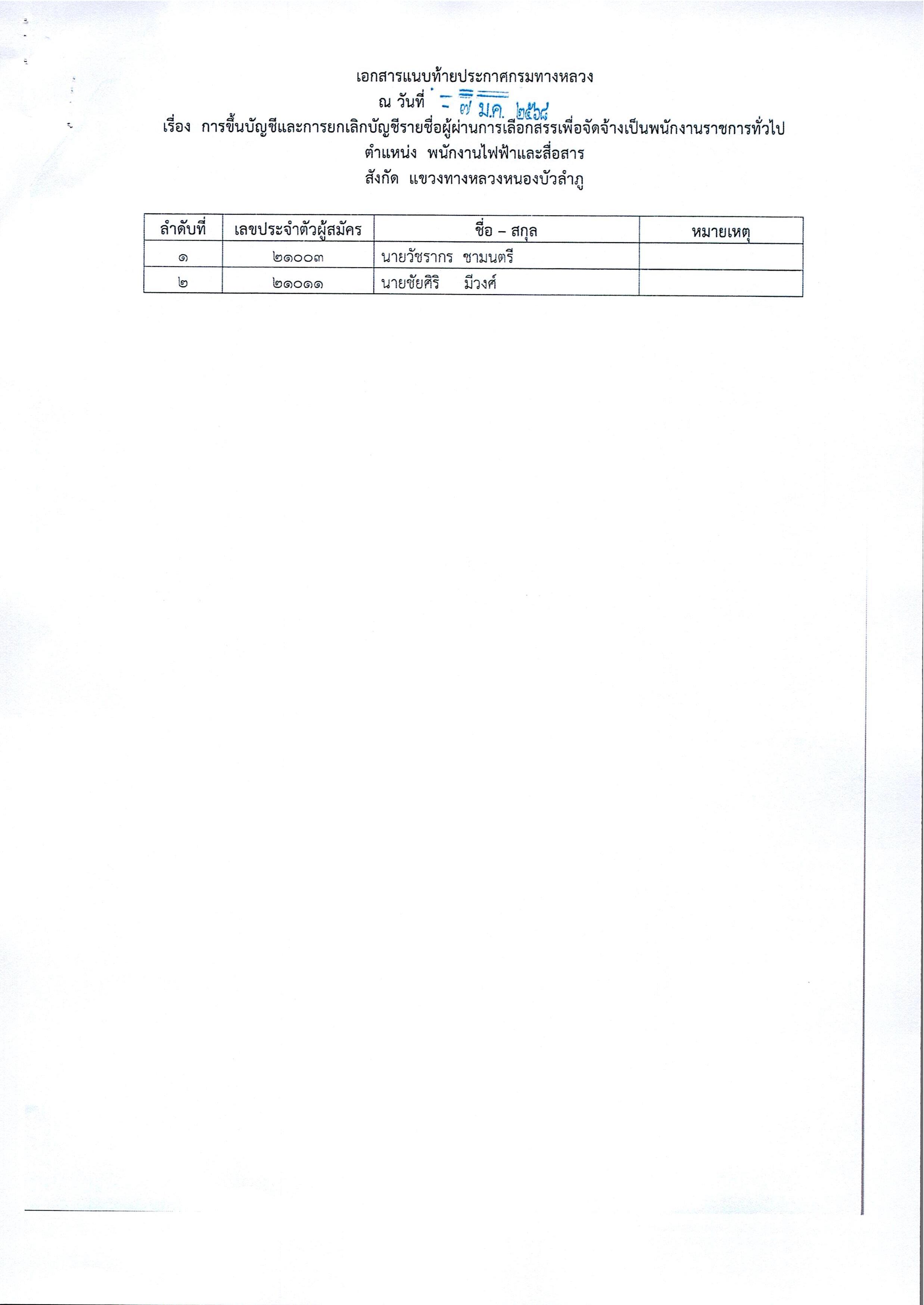ประกาศขึ้นบัญชีและยกเลิกบัญชีรายชื่อผู้ผ่านการเลือกสรรเพื่อจัดจ้างเป็นพนักงานราชการทั่วไป